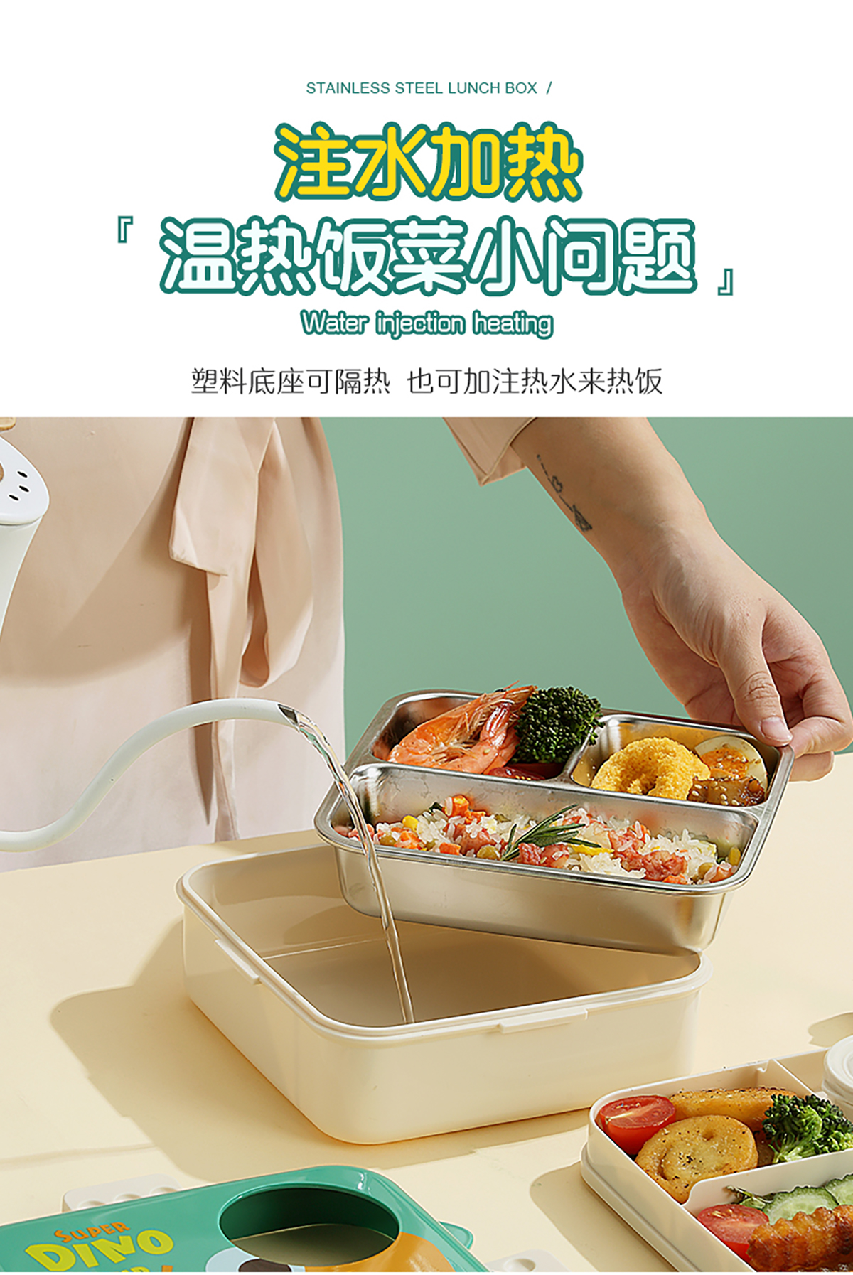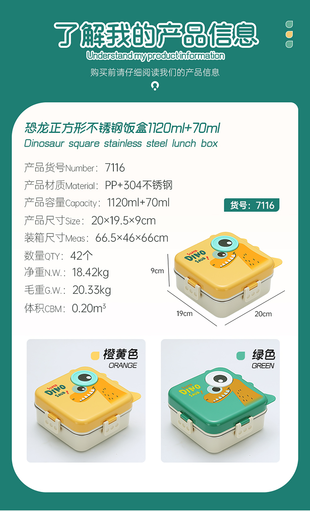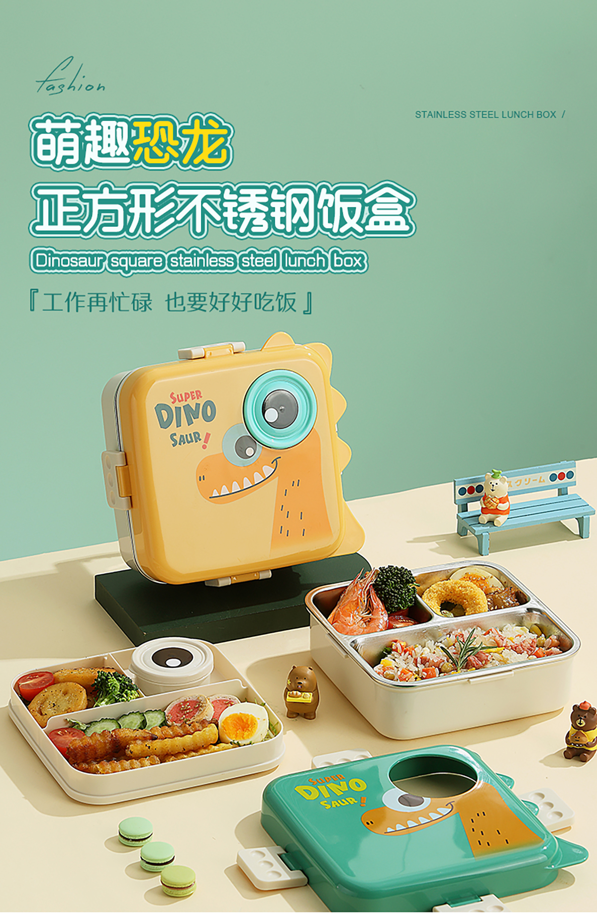 恐龍正方形不銹鋼飯盒1120ml+70ml