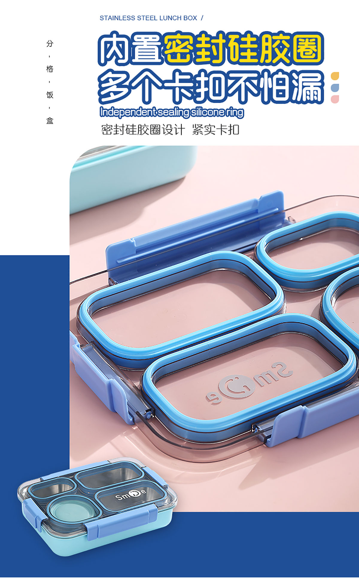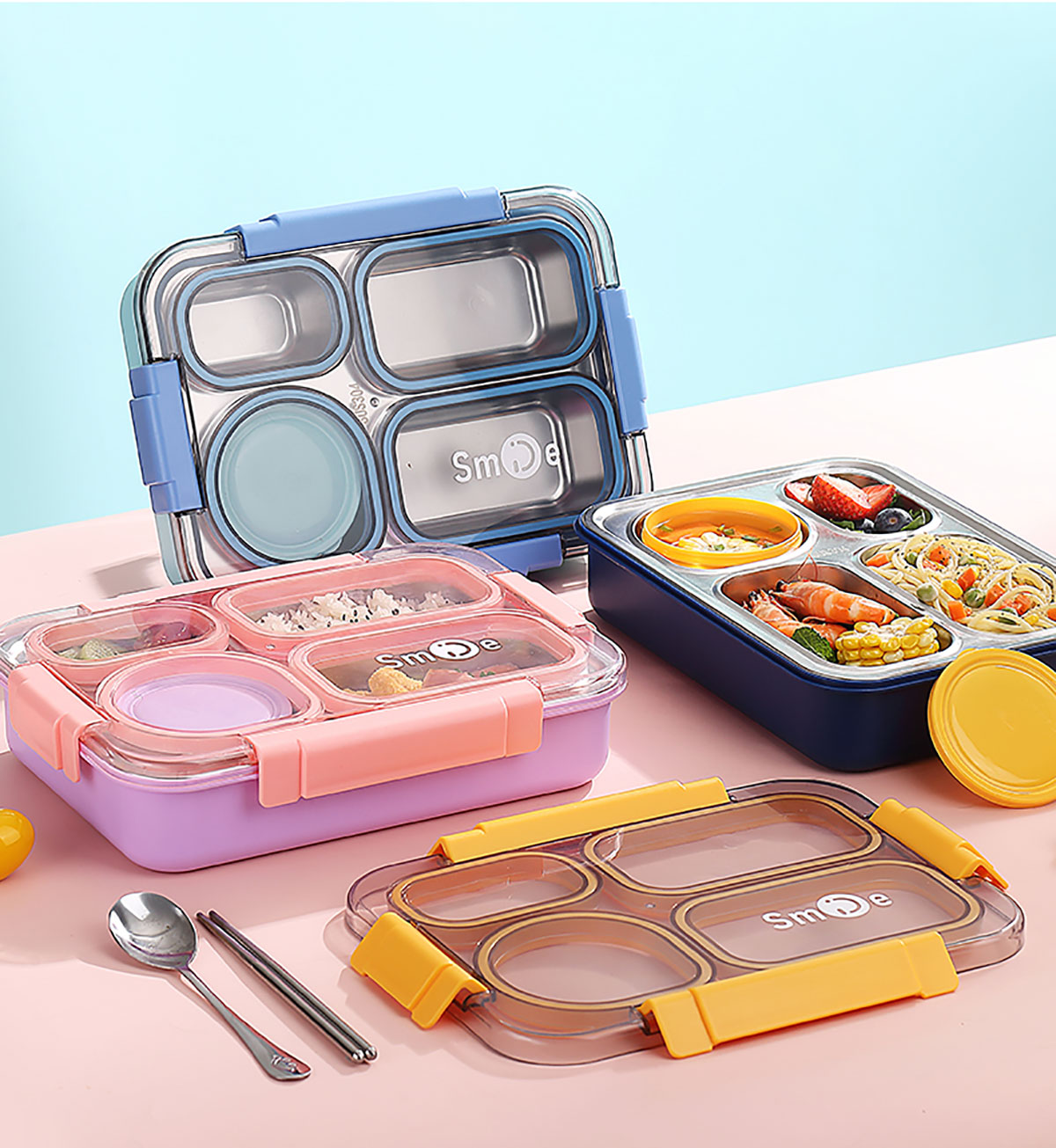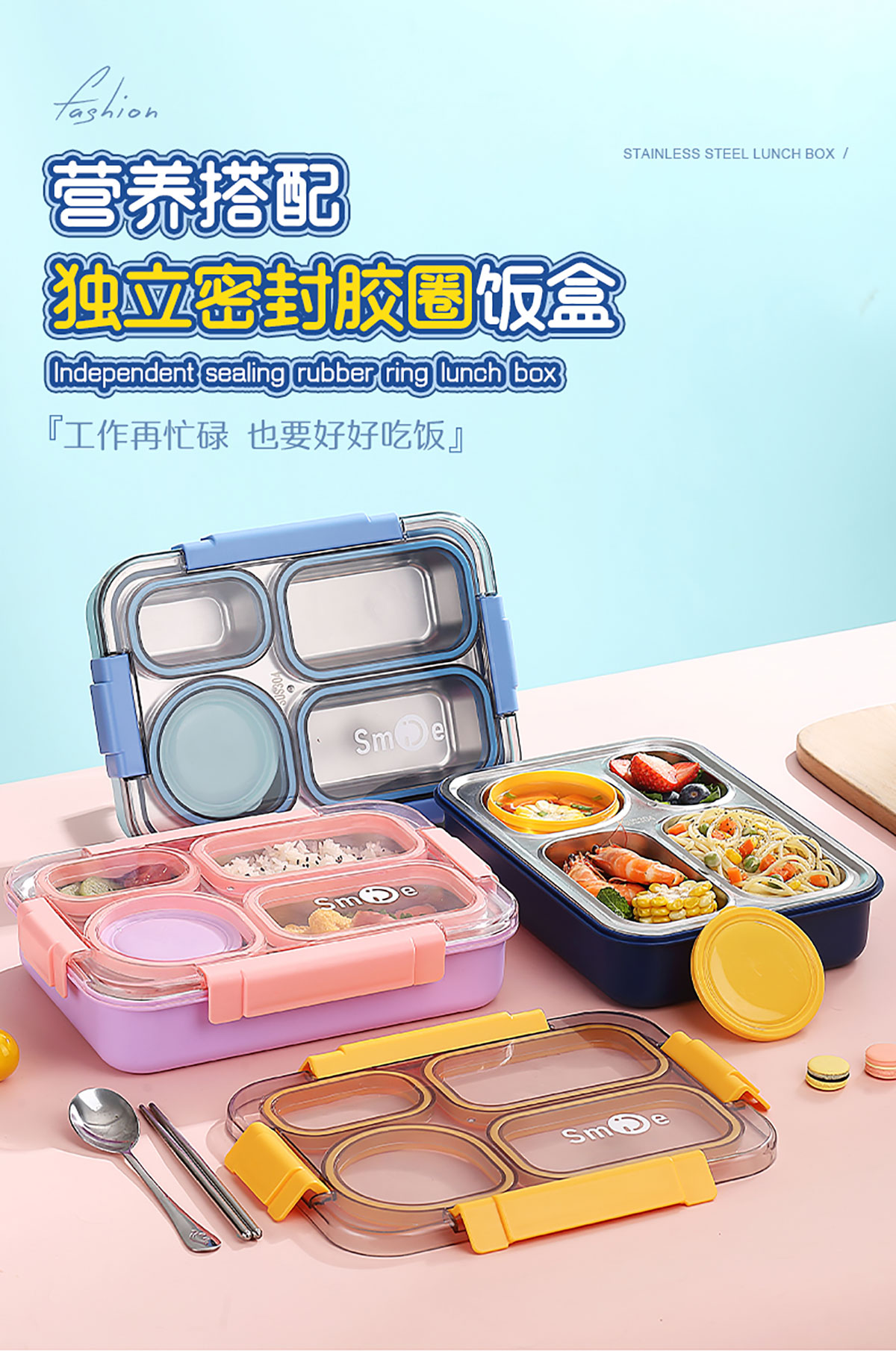 900ml獨立密封不銹鋼餐盒(4格+PP碗150ml+不銹鋼勺筷)