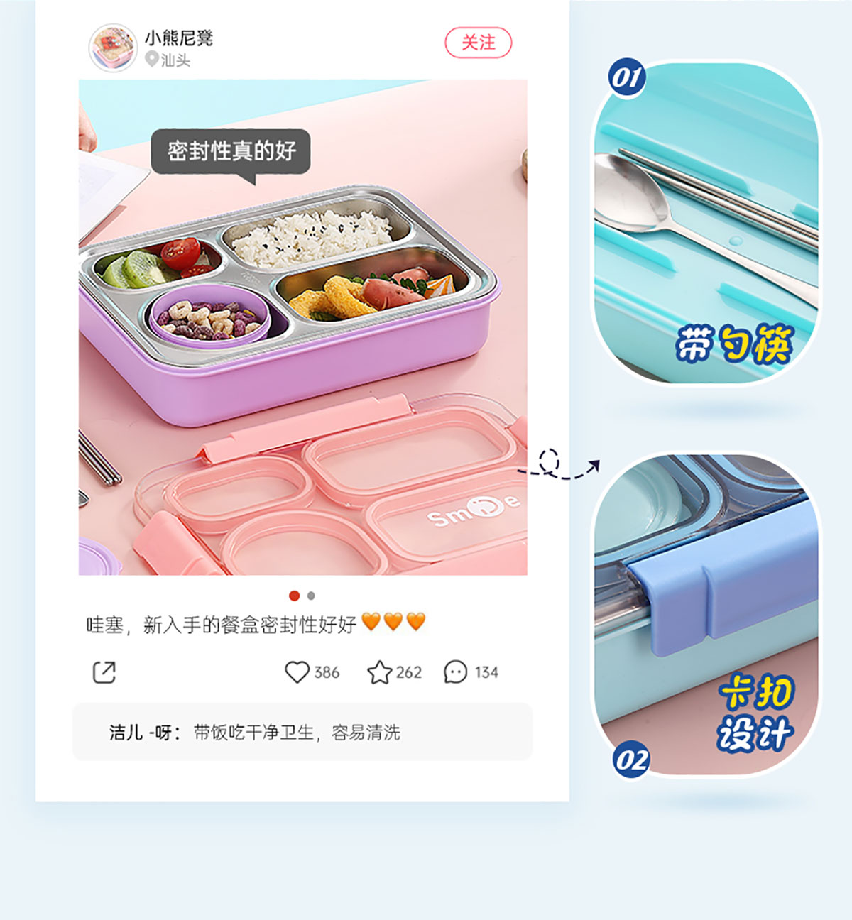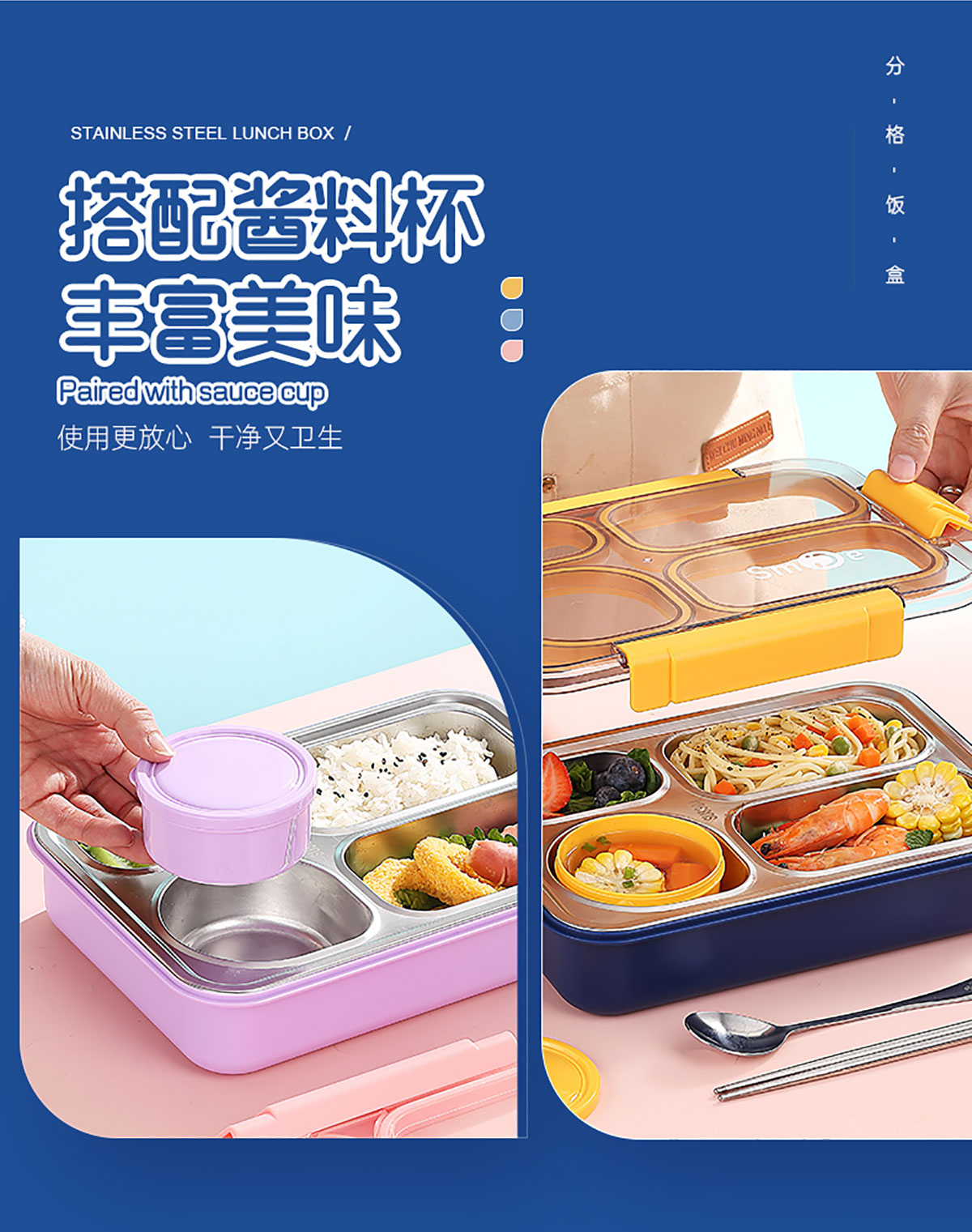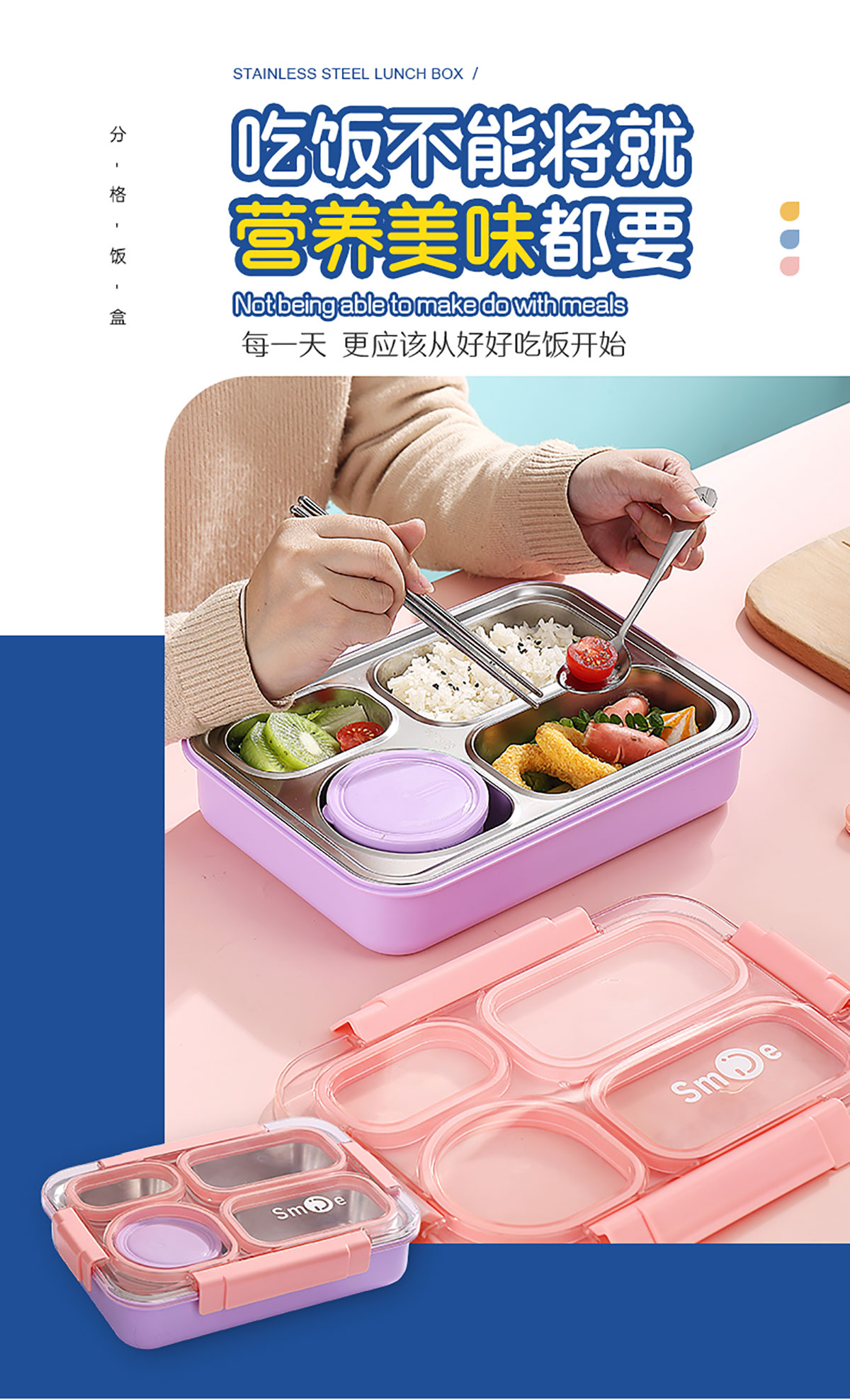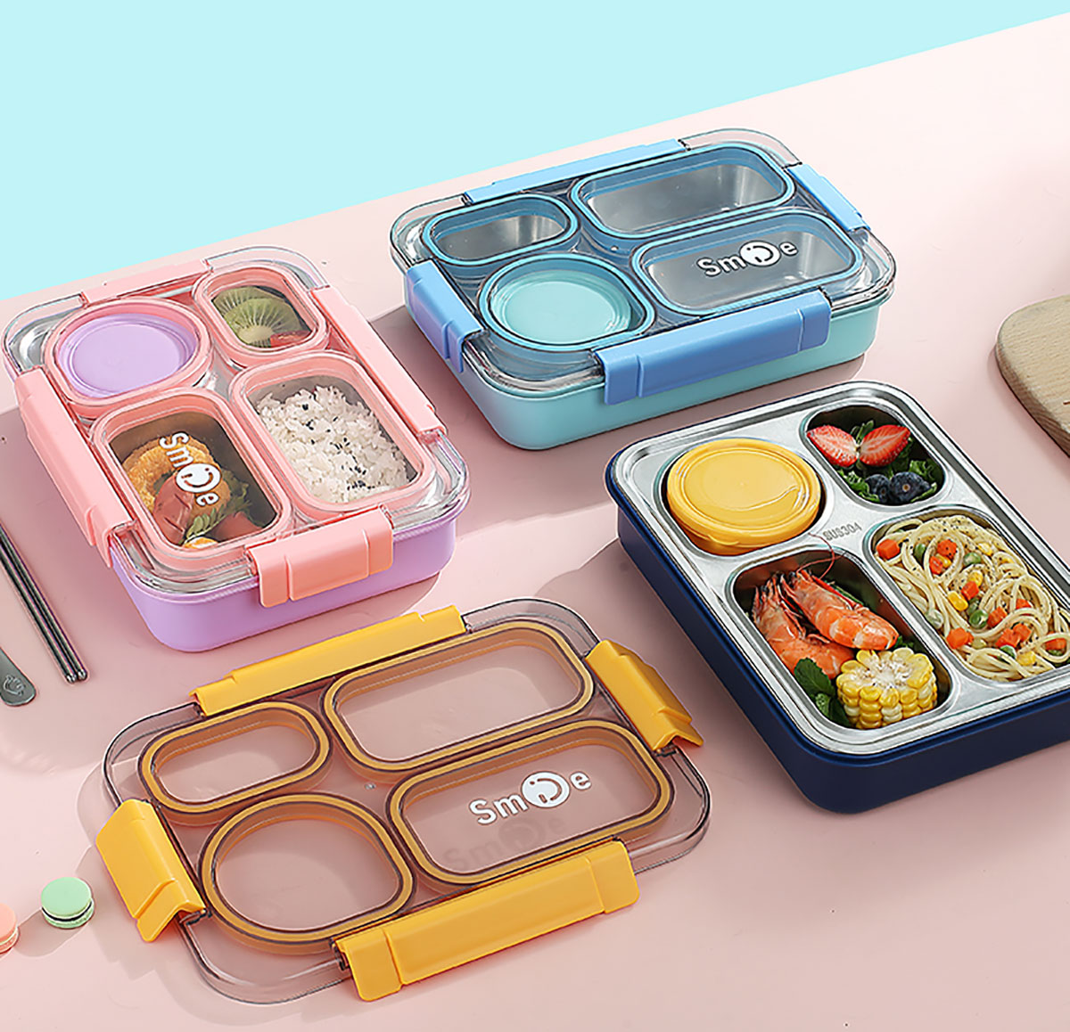900ml獨立密封不銹鋼餐盒(4格+PP碗150ml+不銹鋼勺筷)