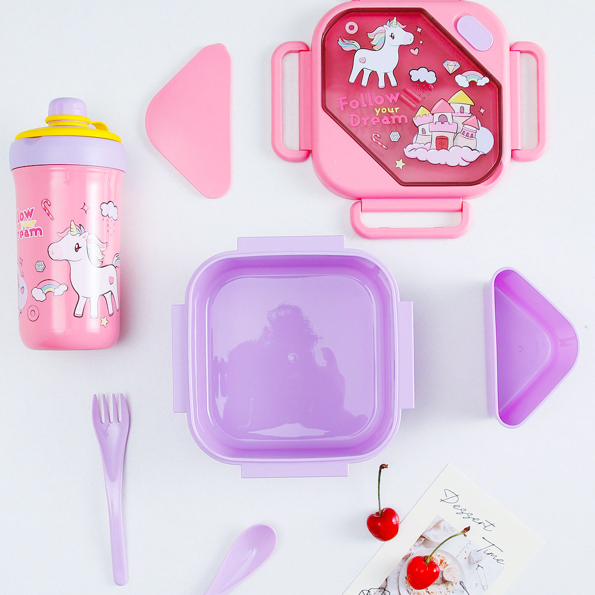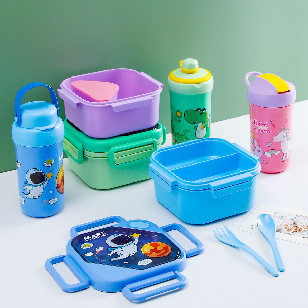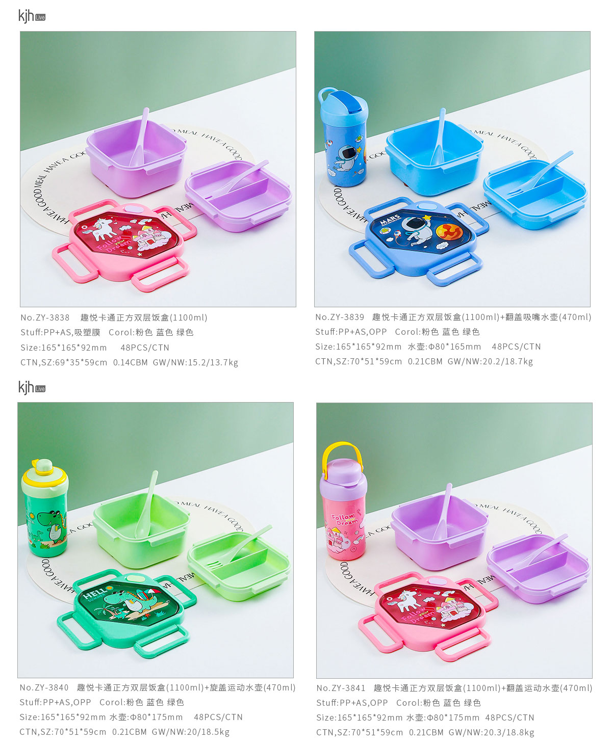 趣悅卡通正方單層(含格子)雙層飯盒+翻蓋吸嘴/旋蓋運動/翻蓋運動水壺