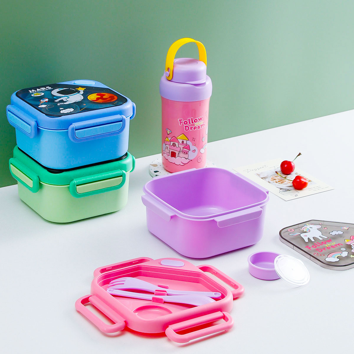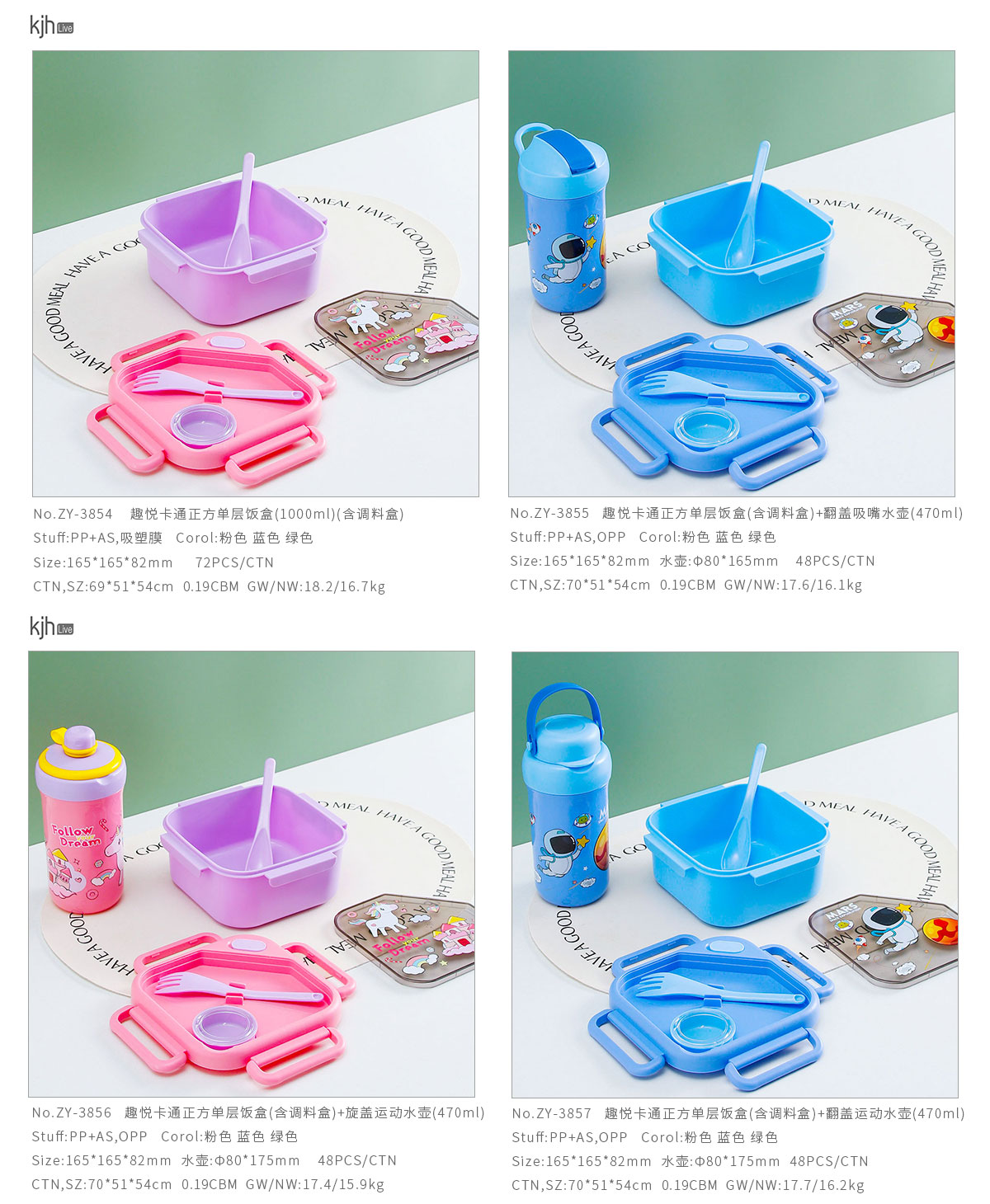 趣悅卡通正方單層/分格飯盒(含調(diào)料盒)+翻蓋吸嘴/旋蓋運動/翻蓋運動水壺