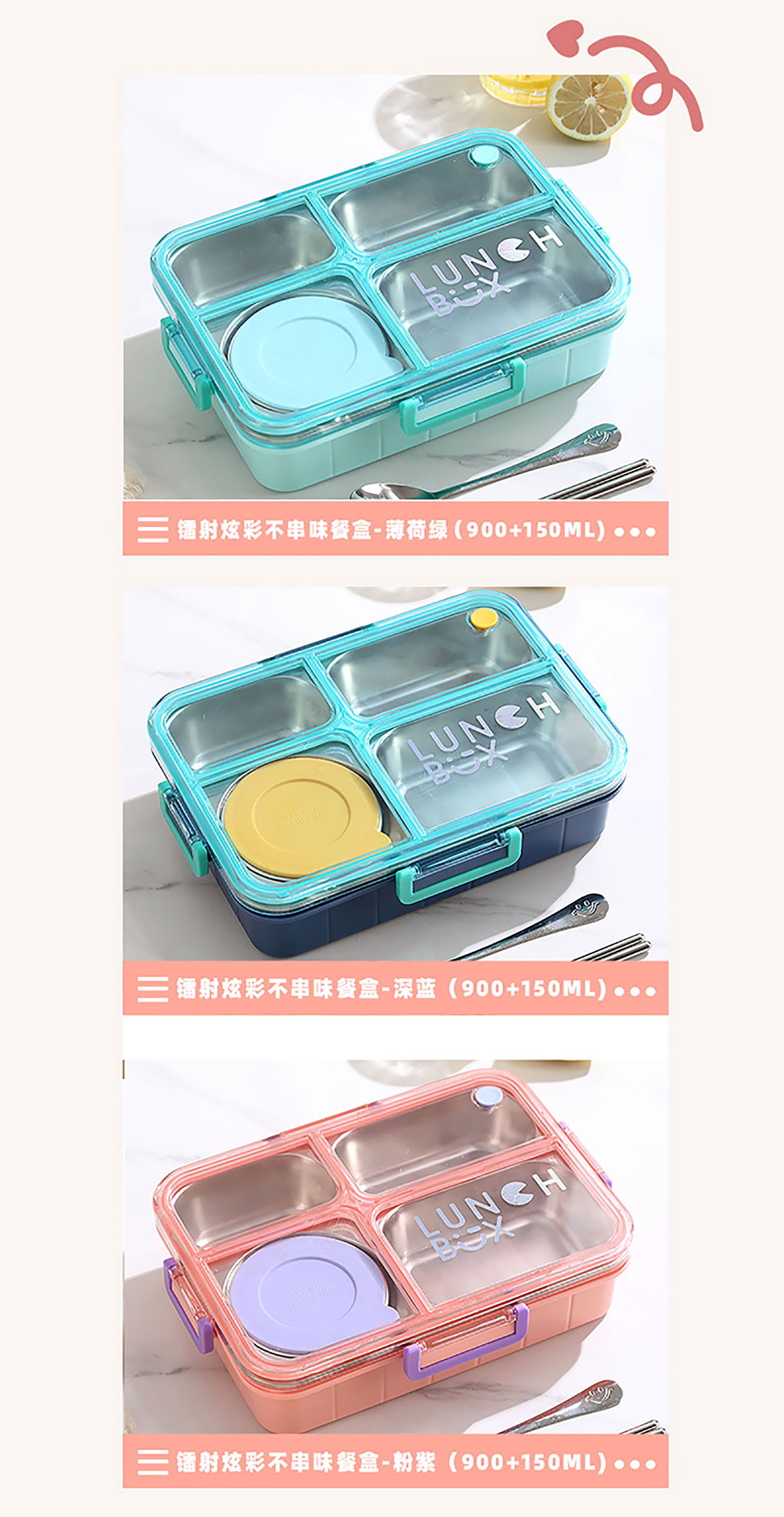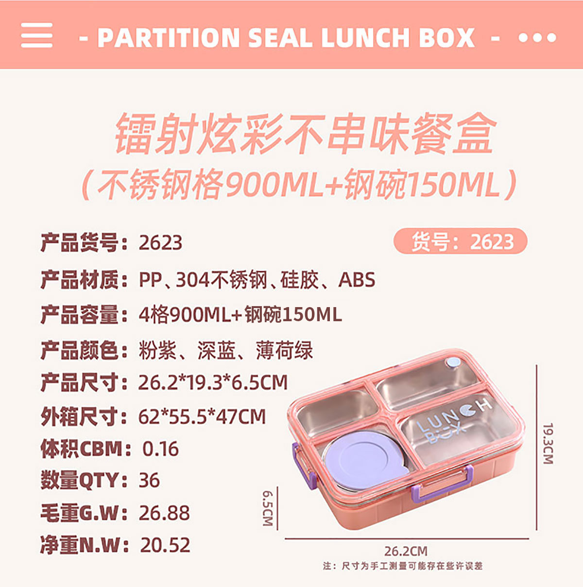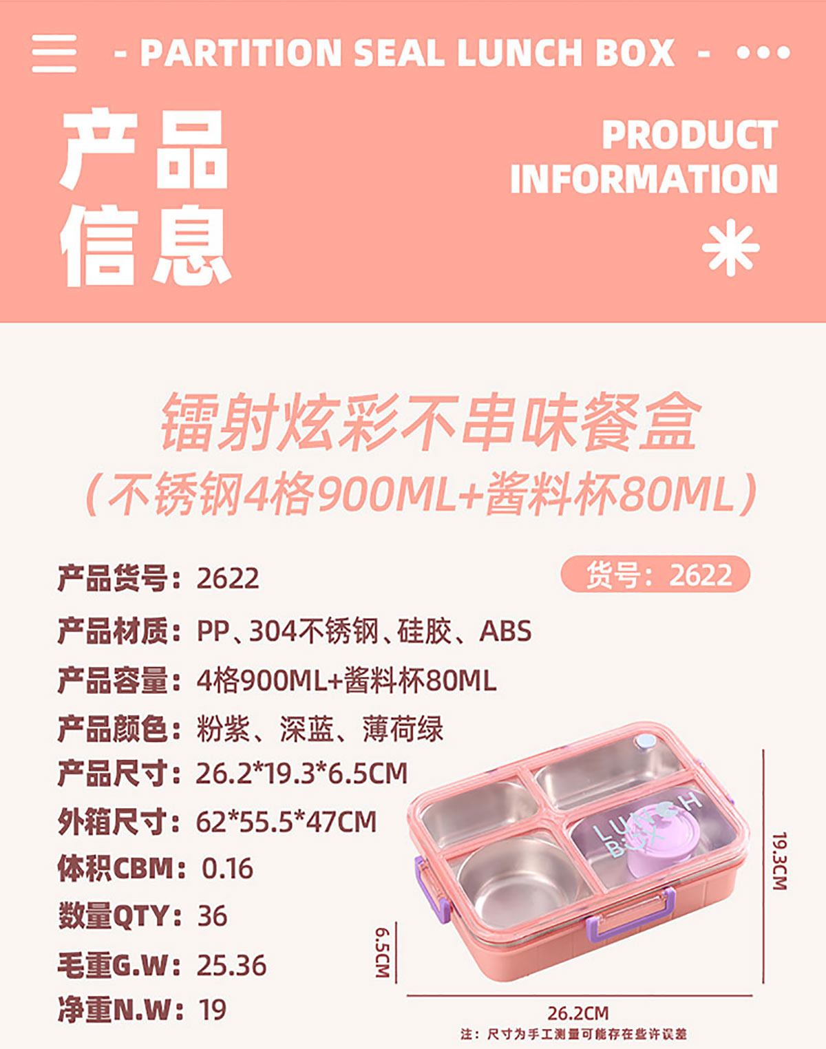 Size: AQX-2622:262*193*65mm/不銹鋼4格900ml+醬料杯80ml