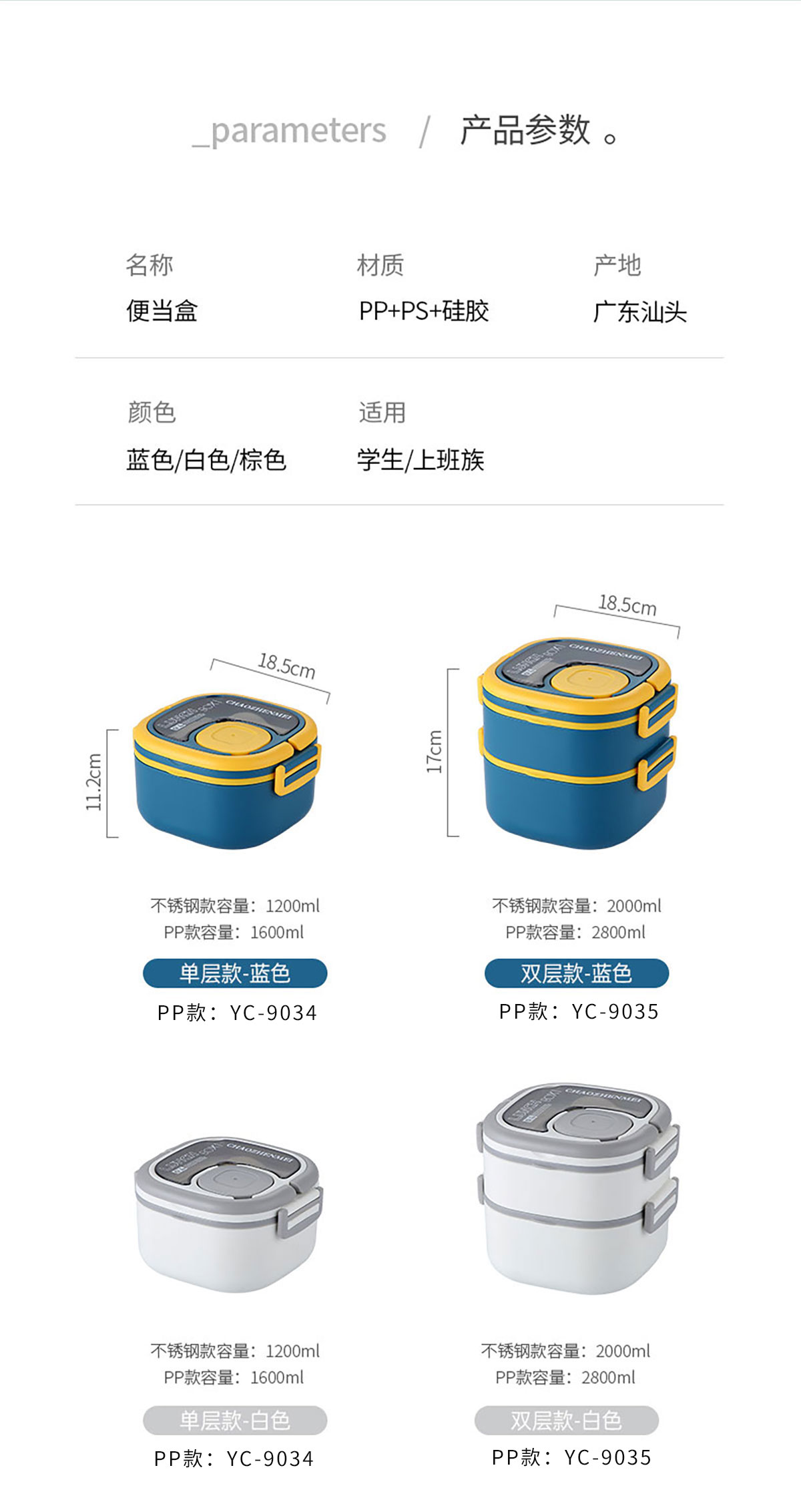 Size: YC-9034(單層):185*185*112mm/1600ml YC-9035(雙層):185*185*170mm/2800ml