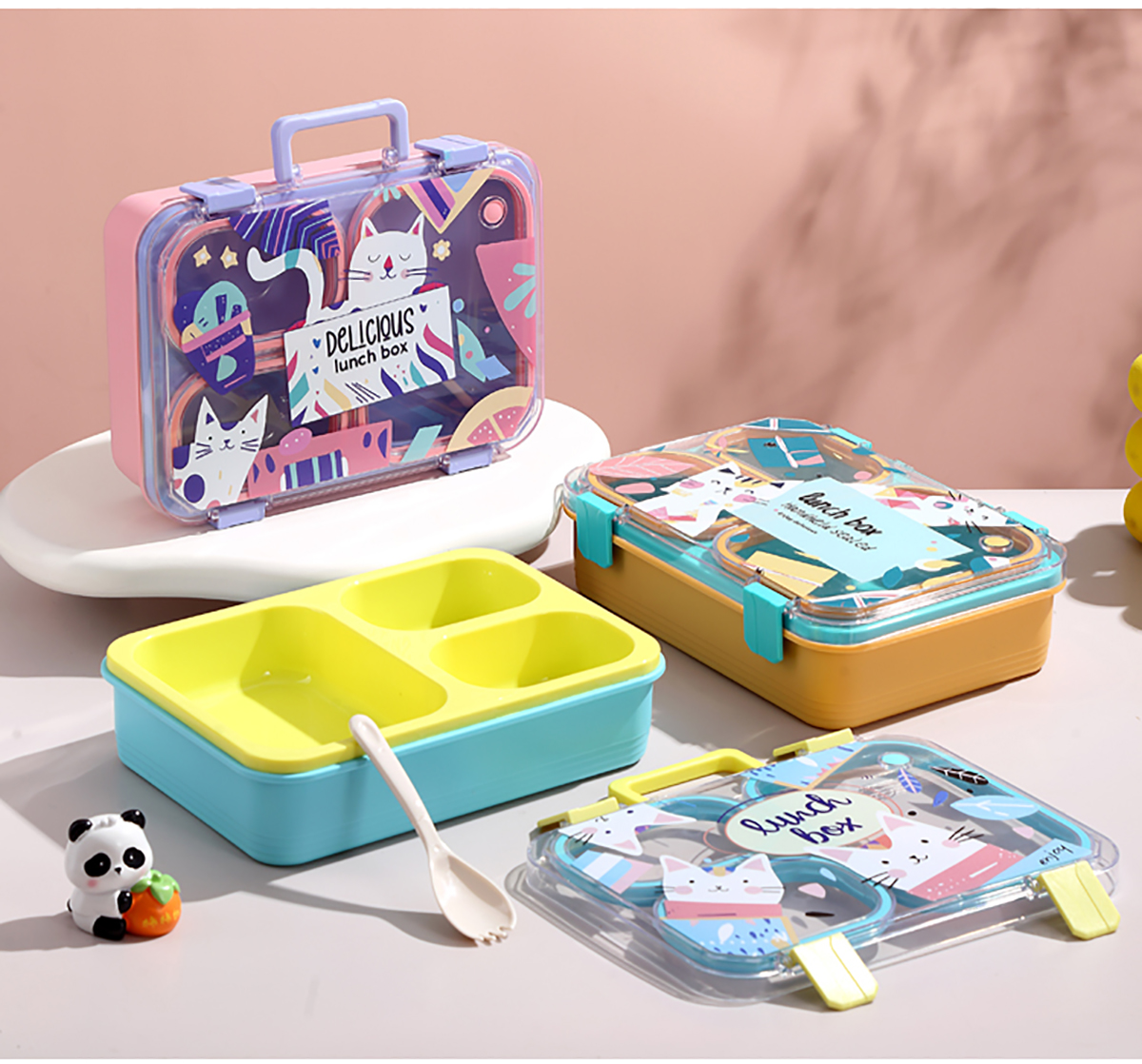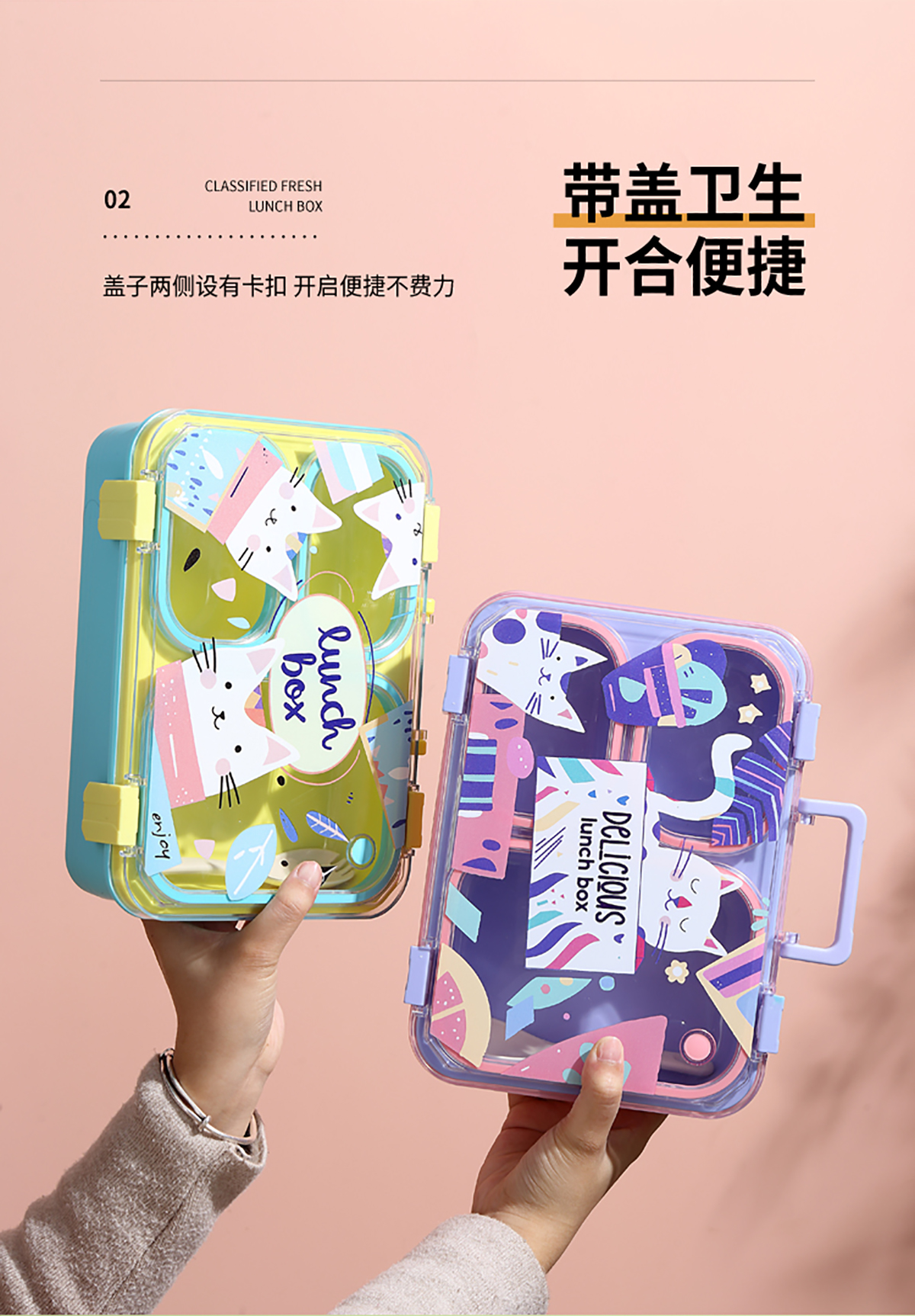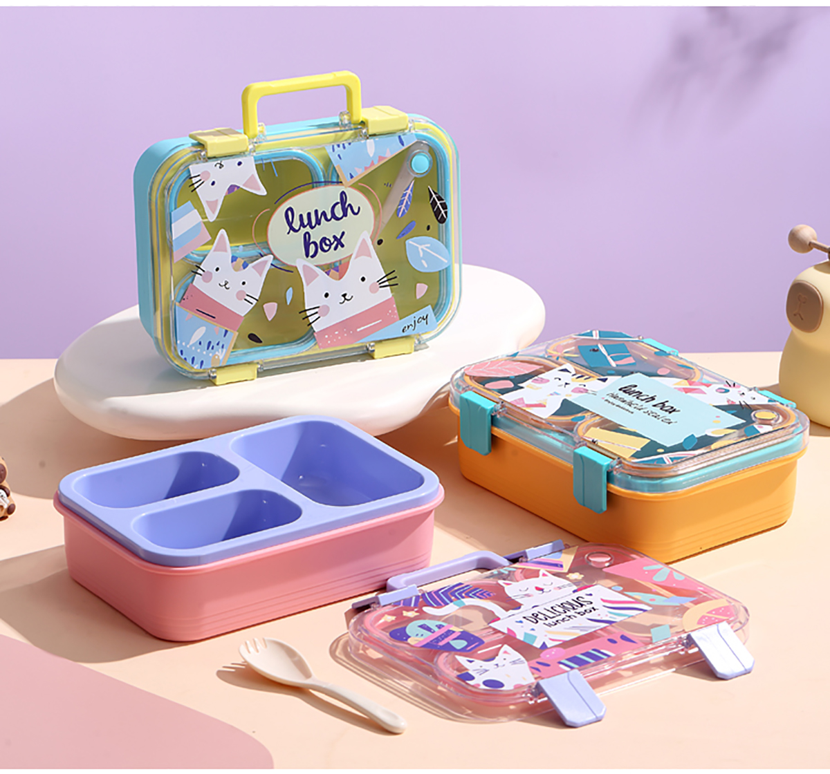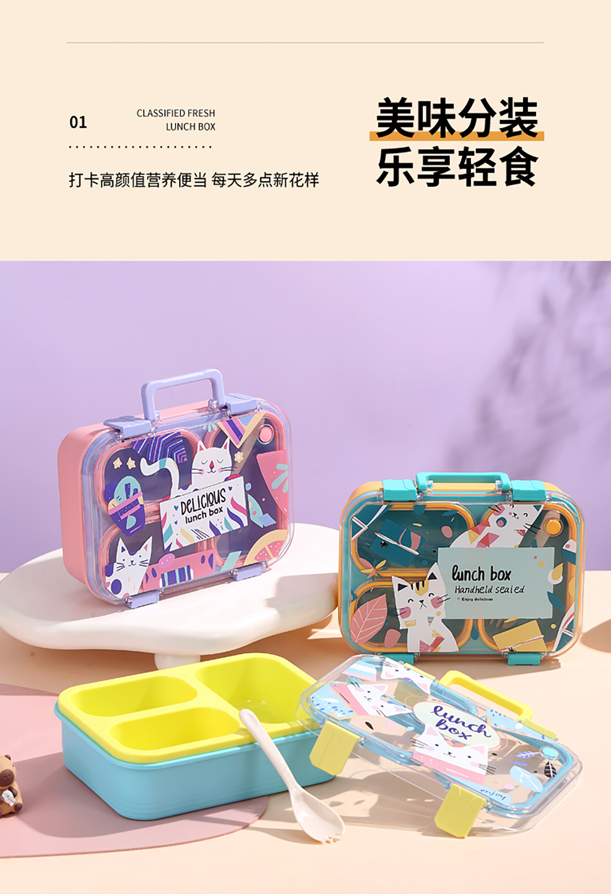 手提卡通貓獨(dú)立密封二格/三格/四格帶碗塑料餐盒